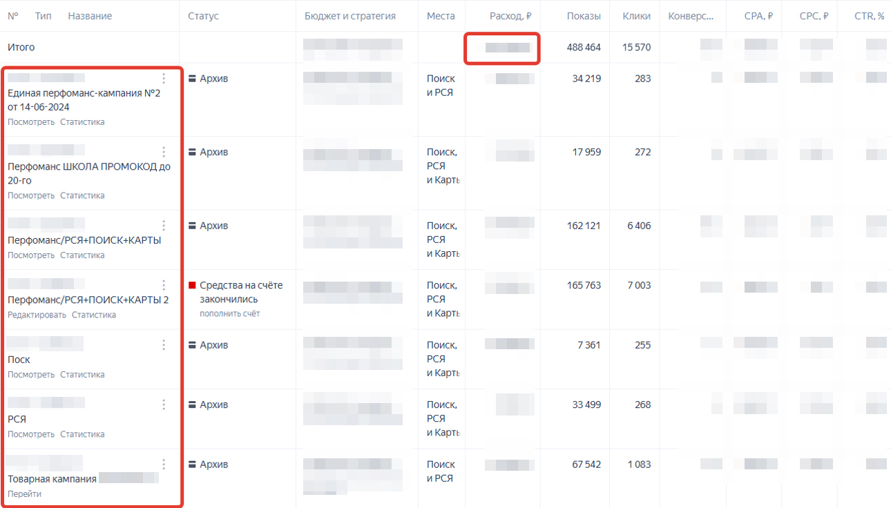 На момент анализа: часть кампаний архивирована, одна кампания остановлена из-за нехватки бюджета. Рекламные кампании запускались прерывисто и не доводились до стабильной оптимизации, а система не успевала накопить корректную статистику и обучиться.