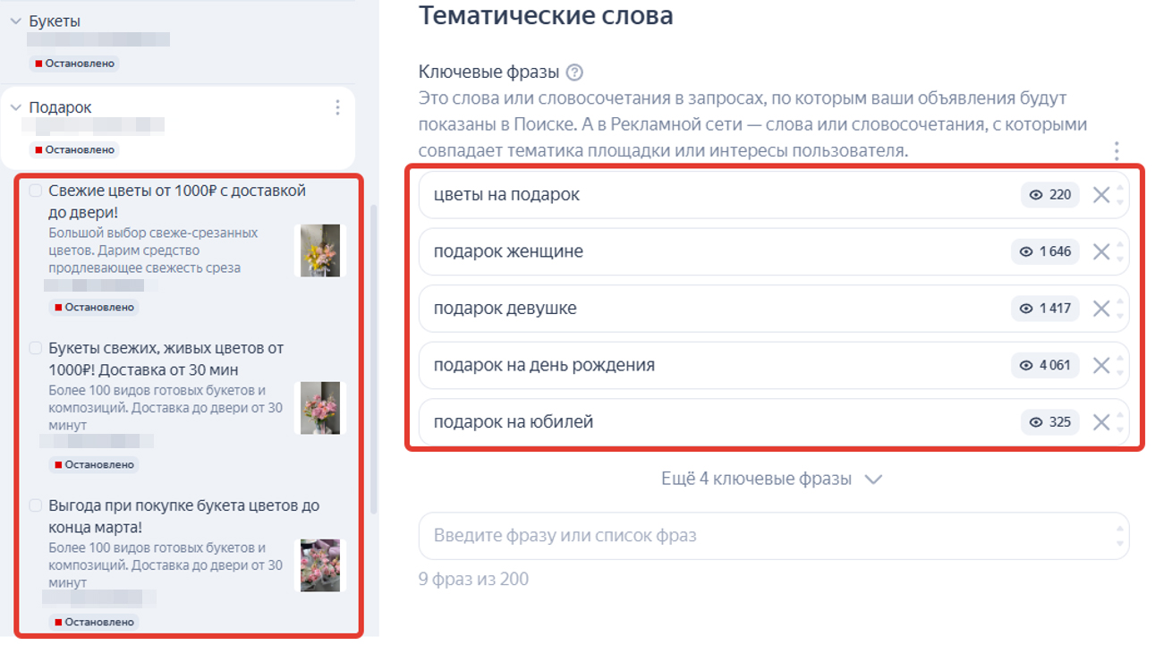 Мы рекомендуем исключать подобные запросы, акцентируя внимание на коммерции: доставка, цена, конкретные поводы и форматы + создавать отдельные группы и объявления в них, которые будут соответствовать ожиданиям пользователя.