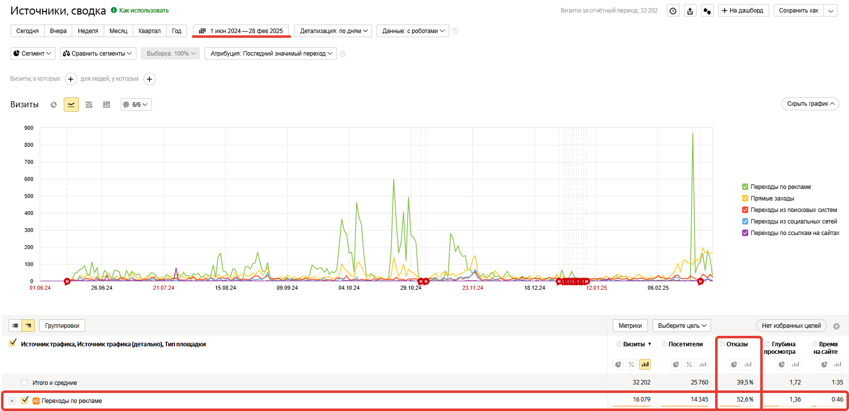 По данным Яндекс.Метрики, показатель отказов с рекламного трафика составляет 52%. Высокий уровень отказов подтверждает ранее выявленные проблемы в рекламных кампаниях. Дополнительно это может указывать на UX-барьеры: скорость загрузки, структура и т.д.