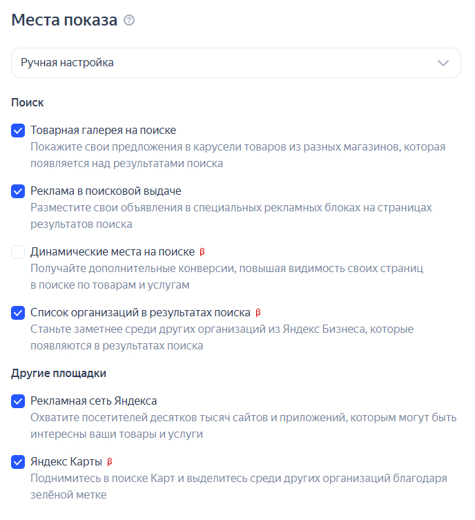 В большинстве кампаний включены одновременно все места размещения: от товарной галереи до Яндекс Карт. Это затрудняет анализ эффективности каждого канала и может привести к неоптимальному расходованию бюджета.