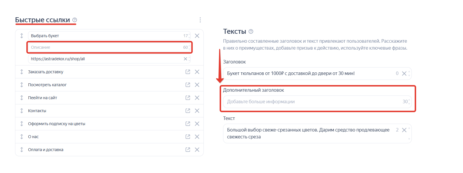 Мы рекомендуем добавить описания к каждой быстрой ссылке, а в их заголовках прописать уникальные торговые предложения + использовать дополнительный заголовок в объявлениях.