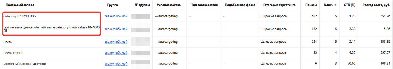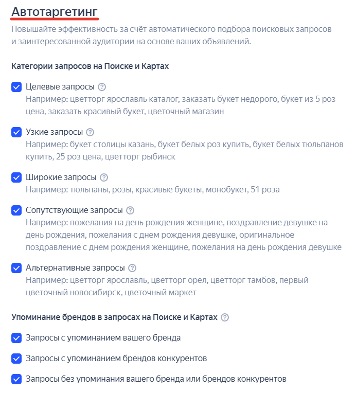 В группах объявлений включены все категории автотаргетинга. В теории — это способ расширить охват и получить дешевые клики, на практике — частая причина нецелевых показов, особенно если в настройках не указаны минус-фразы.
