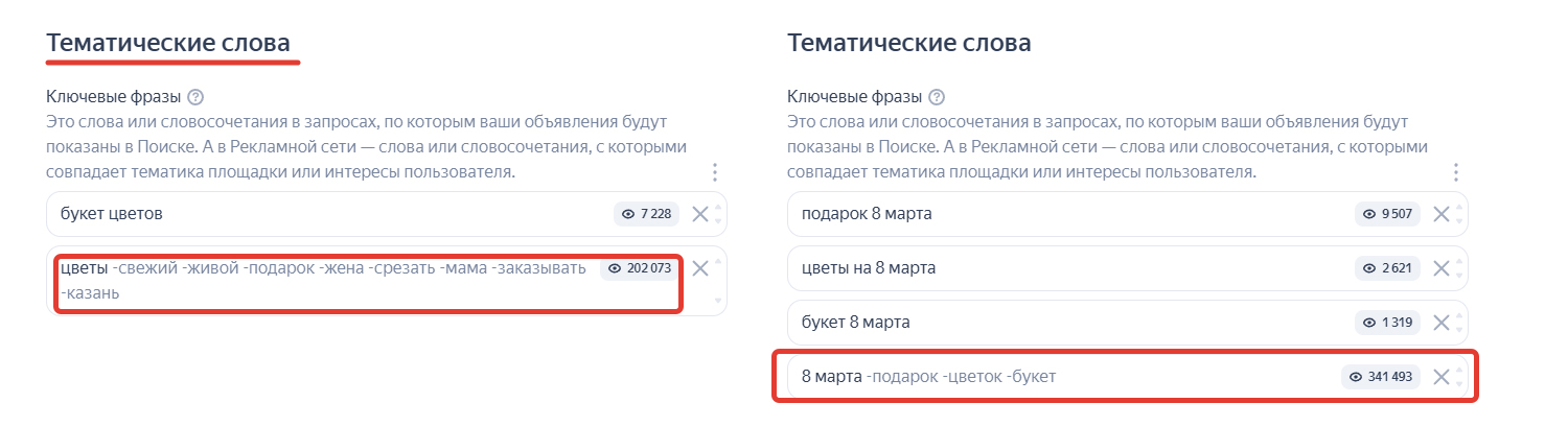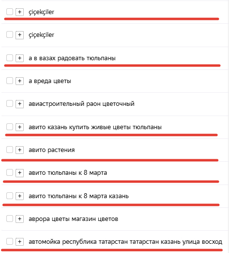 Среди ключевых фраз встречаются широкие и информационные запросы, например, «цветы», «8 марта», «подарок». Такие запросы дают много трафика, но они не про покупку «здесь и сейчас».