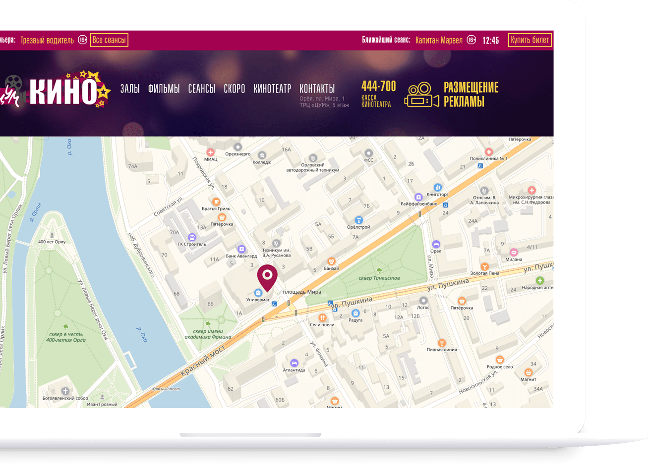 Адрес и телефон кинотеатра указаны в шапке сайта, но для тех, кто плохо знает город, на странице с контактами встроили карту.