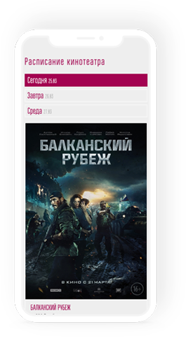 На странице расписания в компактном виде размещена информация по сеансам каждого из фильмов на ближайшие дни. Тут же можно выбрать время и купить билет или перейти на страницу фильма.
