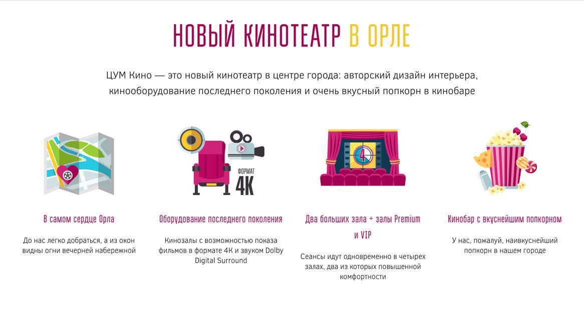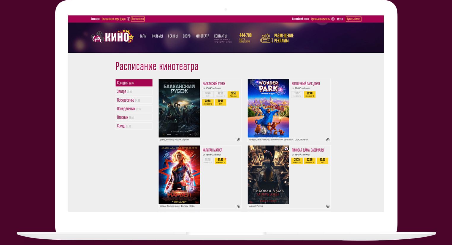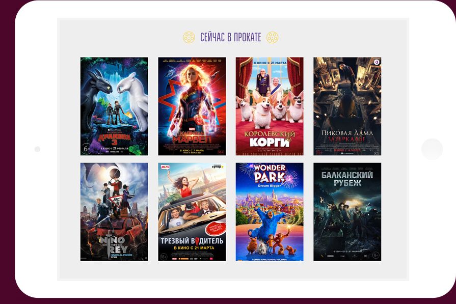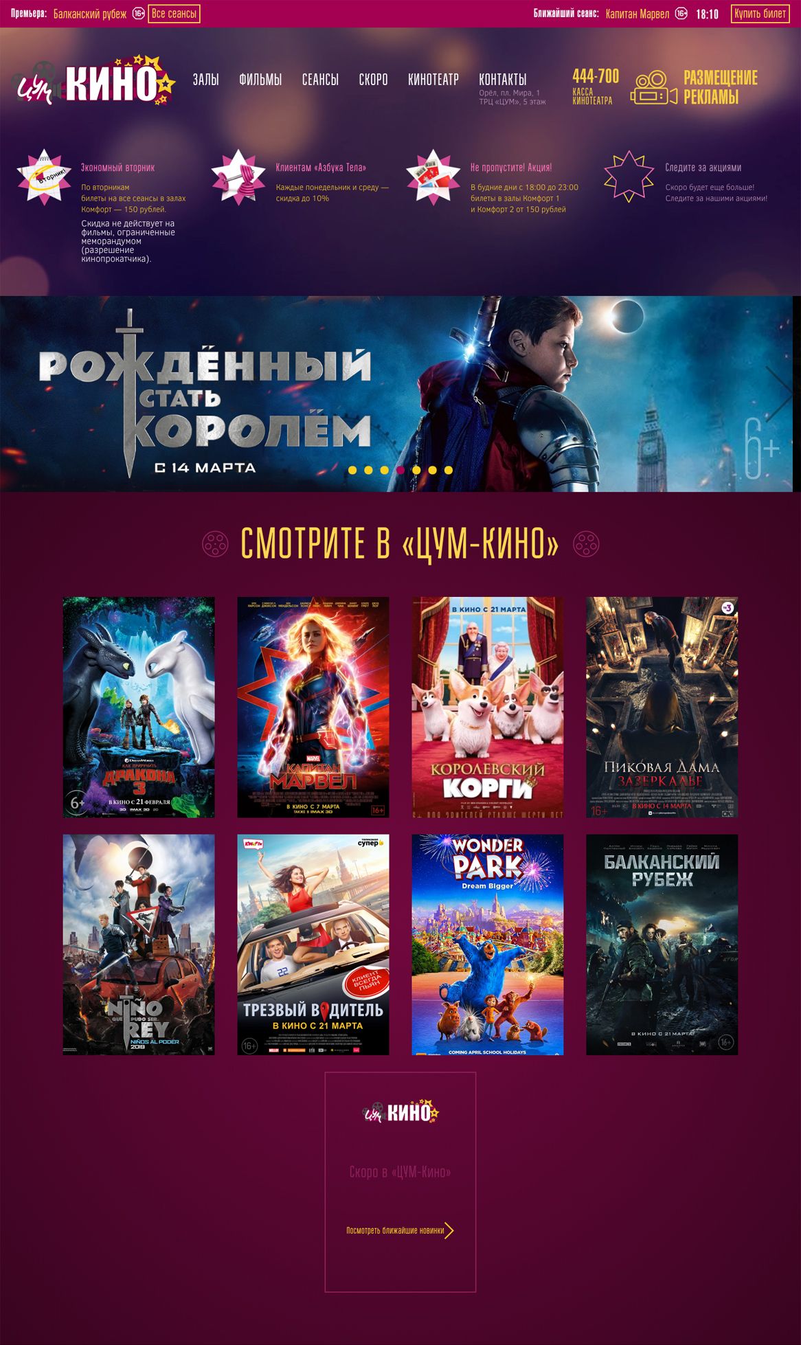 Фильмы в прокате, громкие новинки, расписание сеансов — то, что посетитель ожидает увидеть на сайте кинотеатра в первую очередь. Экспериментировать с этим не стоит, поэтому на первом экране встречает слайдер с актуальными фильмами, а в меню легко найти расписание на ближайшие дни. Фишка сайта — в верхней части экрана закреплена плашка с указанием ближайшего сеанса и возможностью сразу перейти к покупке билета. А для любителей сэкономить — информация об акциях.