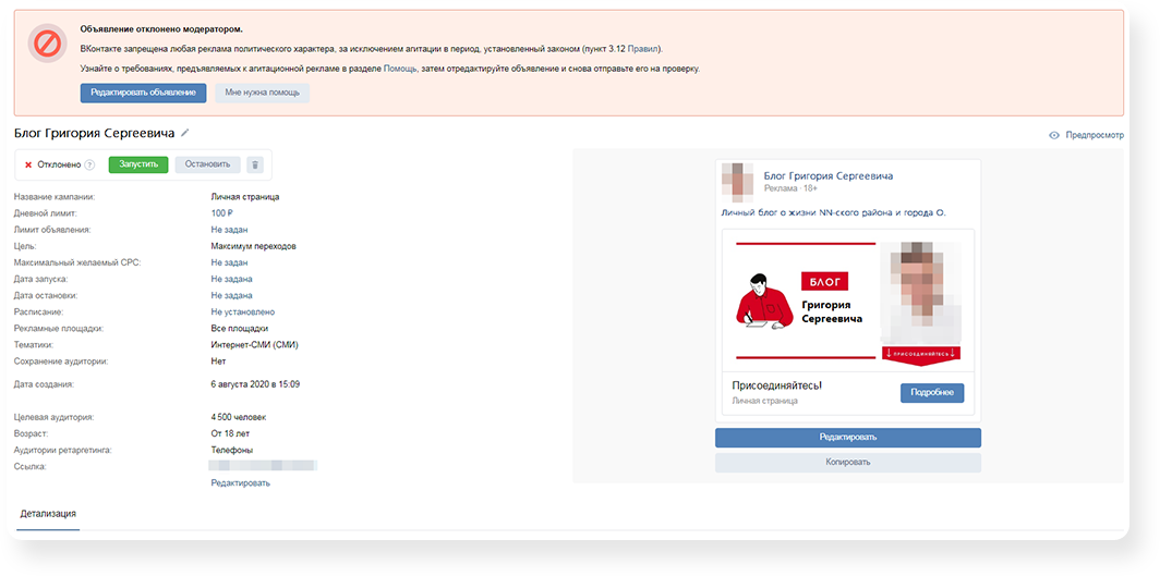 Надо сказать, что модераторы ВКонтакте такой заход не оценили, и рекламу личной страницы не пропустили. Возможно, сотрудники соцсети имеют списки кандидатов в депутаты или какие-то скрытые отметки по каждому владельцу страницы. В Директе (РСЯ) модерацию прошли 97% объявлений.