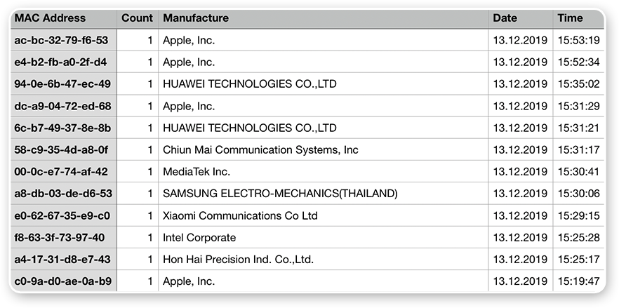 Так выглядят собранные MAC-адреса устройств, на которые можно транслировать рекламу