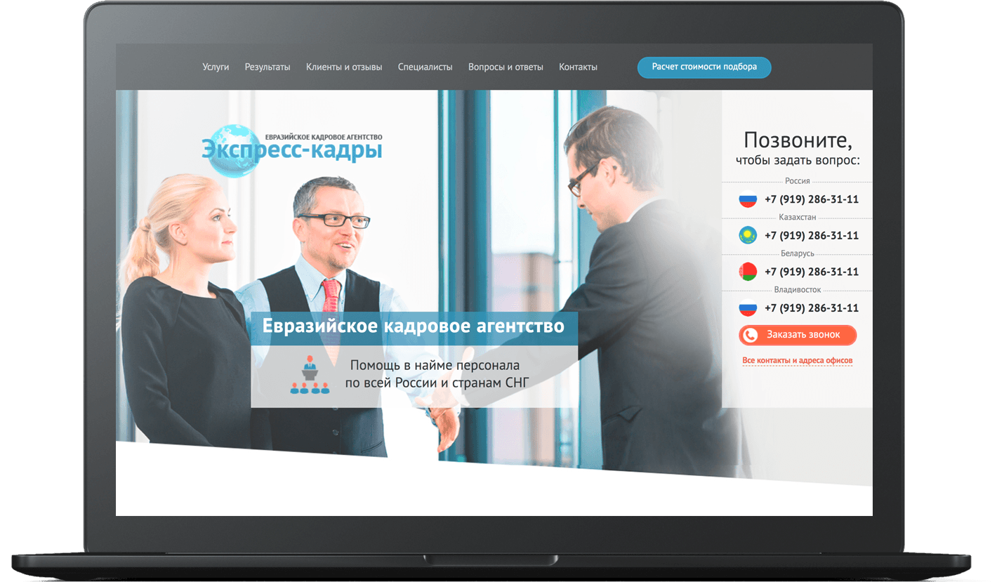 Как раз для компании, помогающей находить и нанимать персонал, и понадобилось разработать сайт. После беседы с руководителем компании остановились на одностраничнике, так как он позволяет в компактной форме рассказать об услугах, преимуществах и опыте агентства.