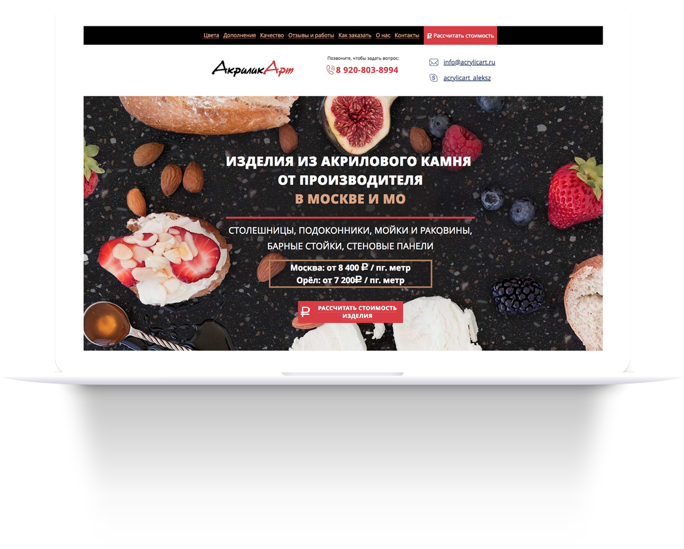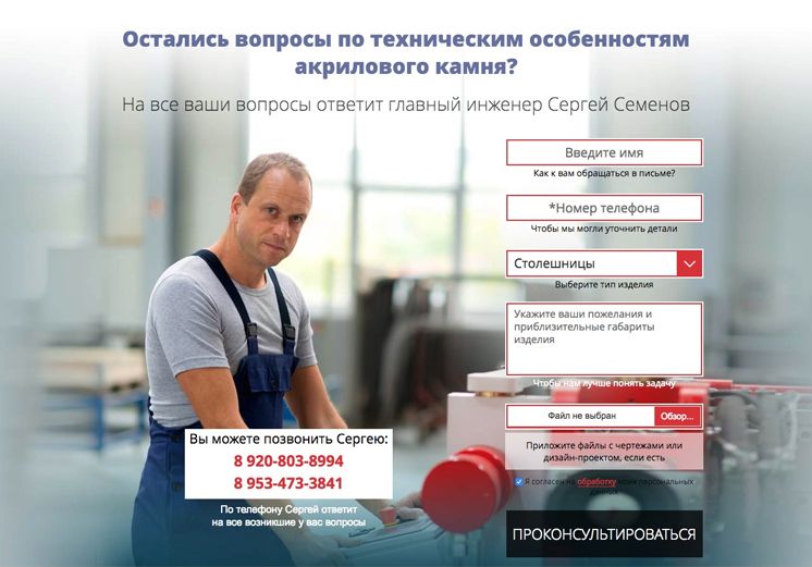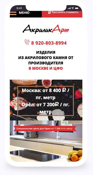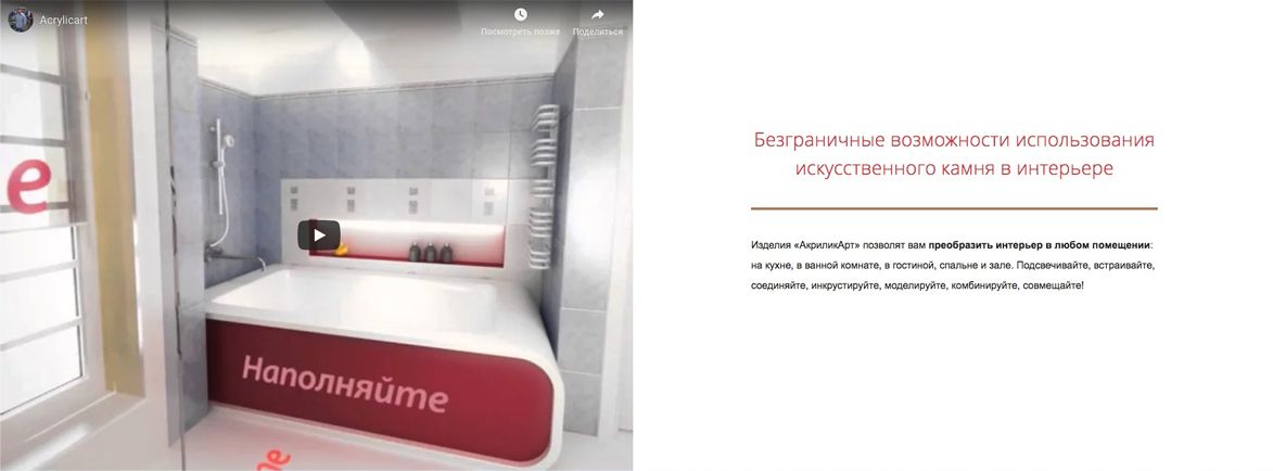 Чтобы это понять, мы общались с руководителем компании АкриликАрт, изучали сайты других компаний, запросы в поисковиках. А после — свели всё в одностраничник, где рассказали о преимуществах акрилового камня перед другими материалами, о возможностях отделки, о цветовой гамме. В таких сферах обязательно показать примеры работ и рассказать о компании и порядке работы — чтобы посетитель убедился в надёжности фирмы.