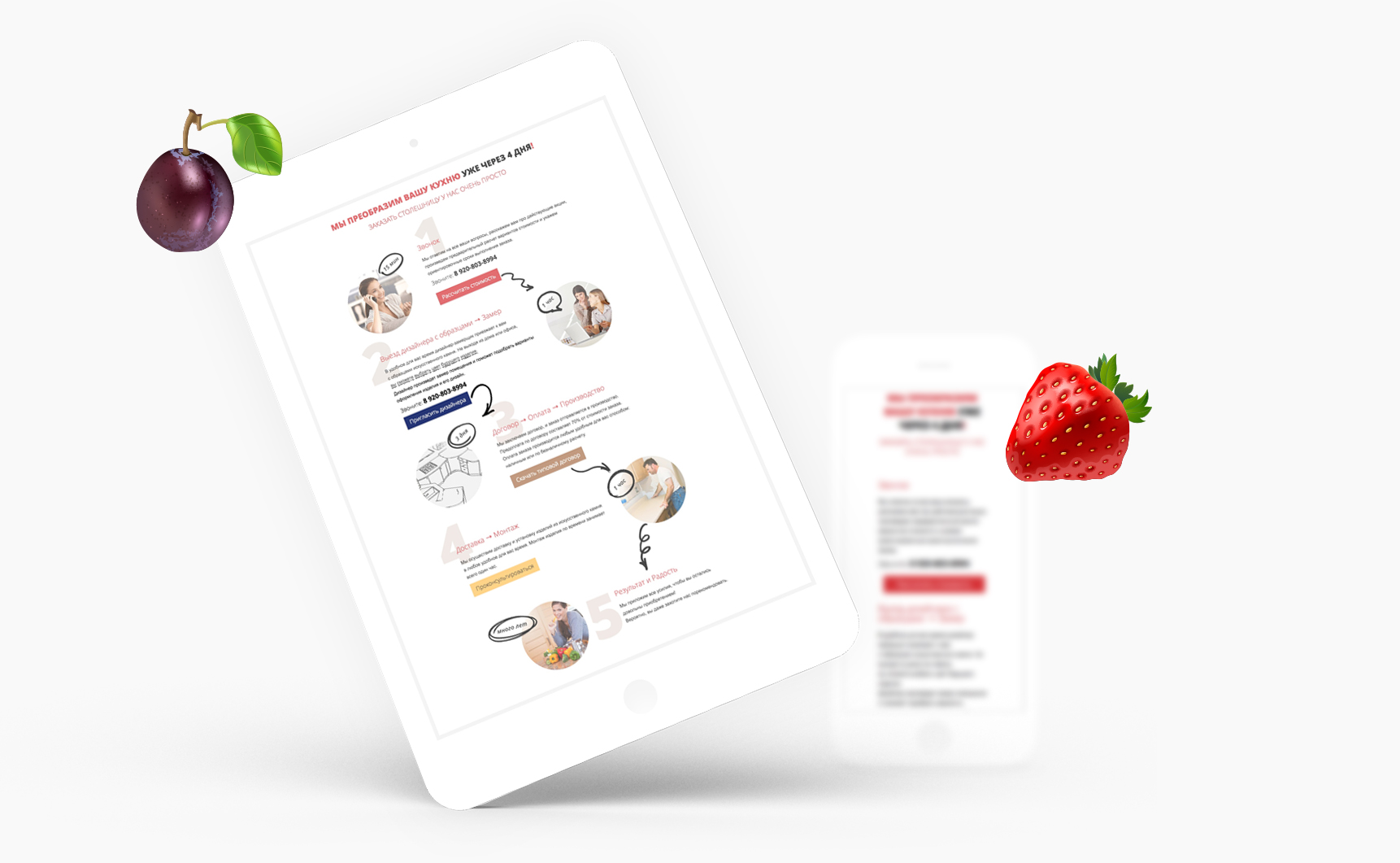 На первом экране мы разместили сведения о компании, какие изделия она производит. Благодаря этому посетитель сразу может понять, что делает организация, в каком регионе и даже увидеть примерные цены. для оформления использовали очень яркую и «вкусную» картинку, но на мобильной версии дизайн немного упрощается — в условиях ограниченного места приоритет должен быть у полезной информации.