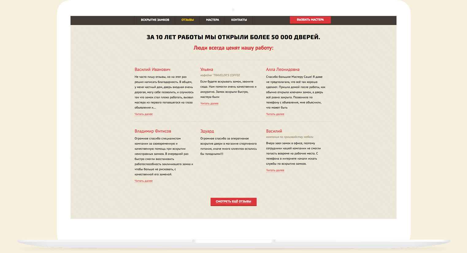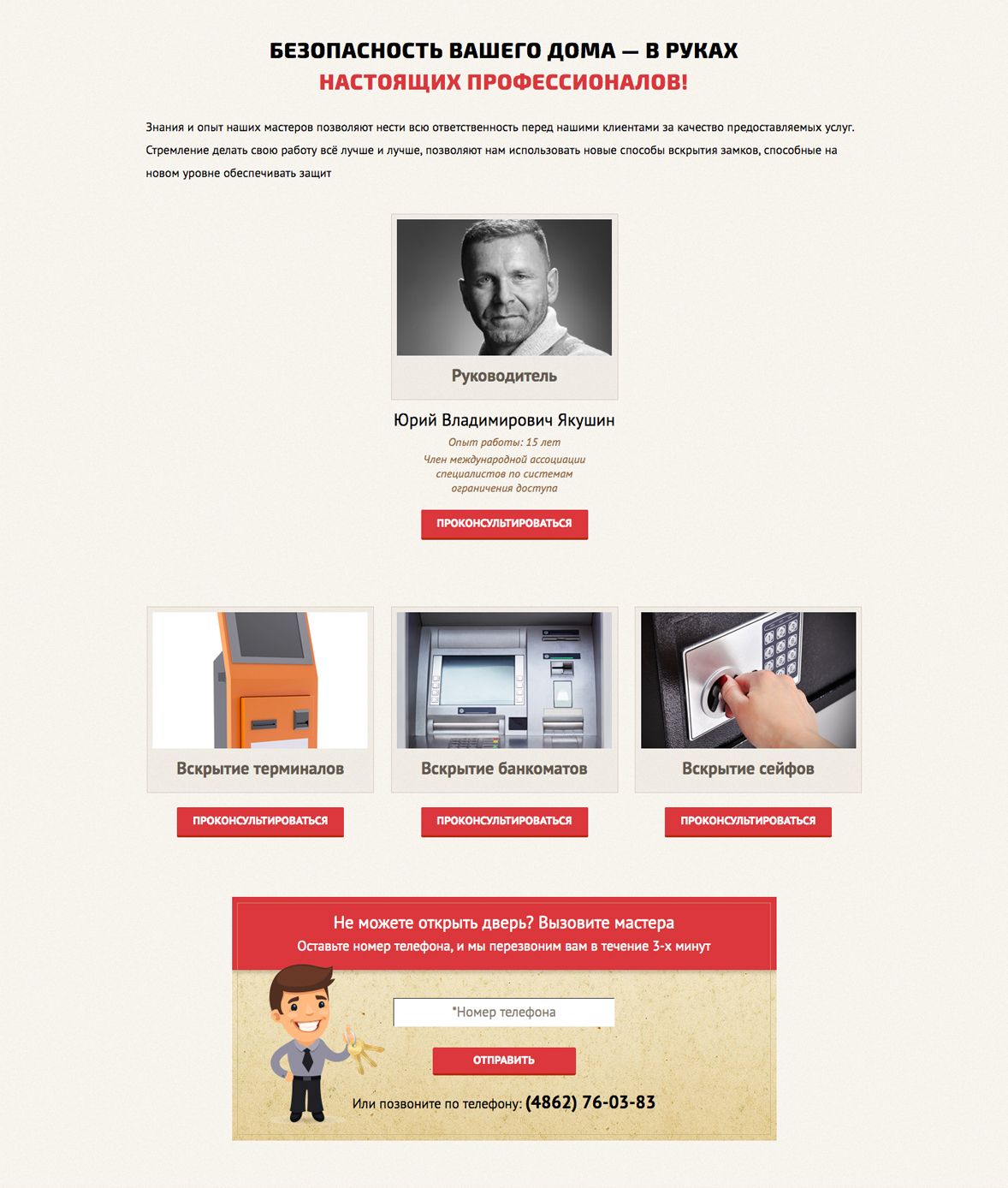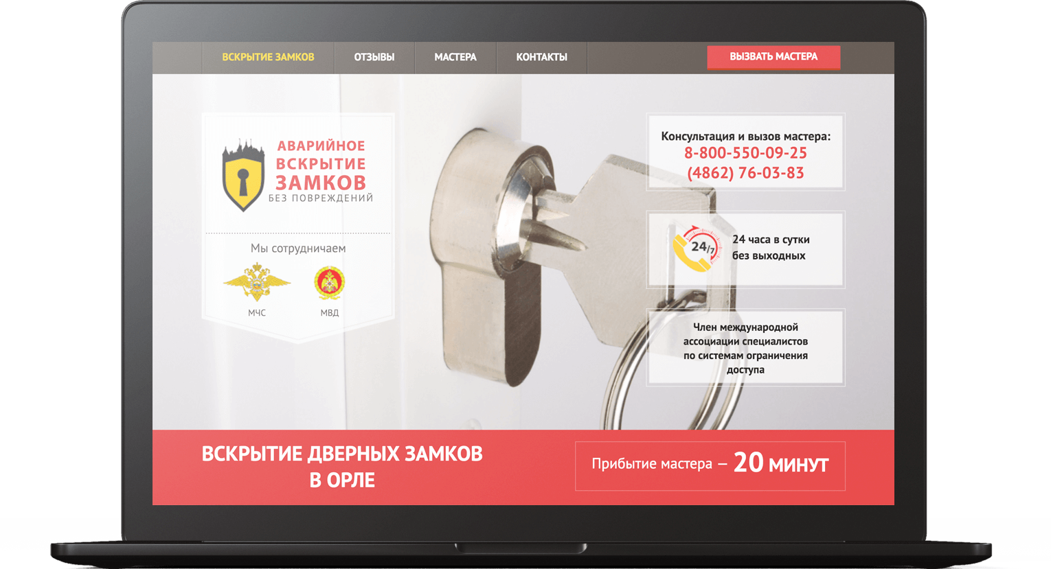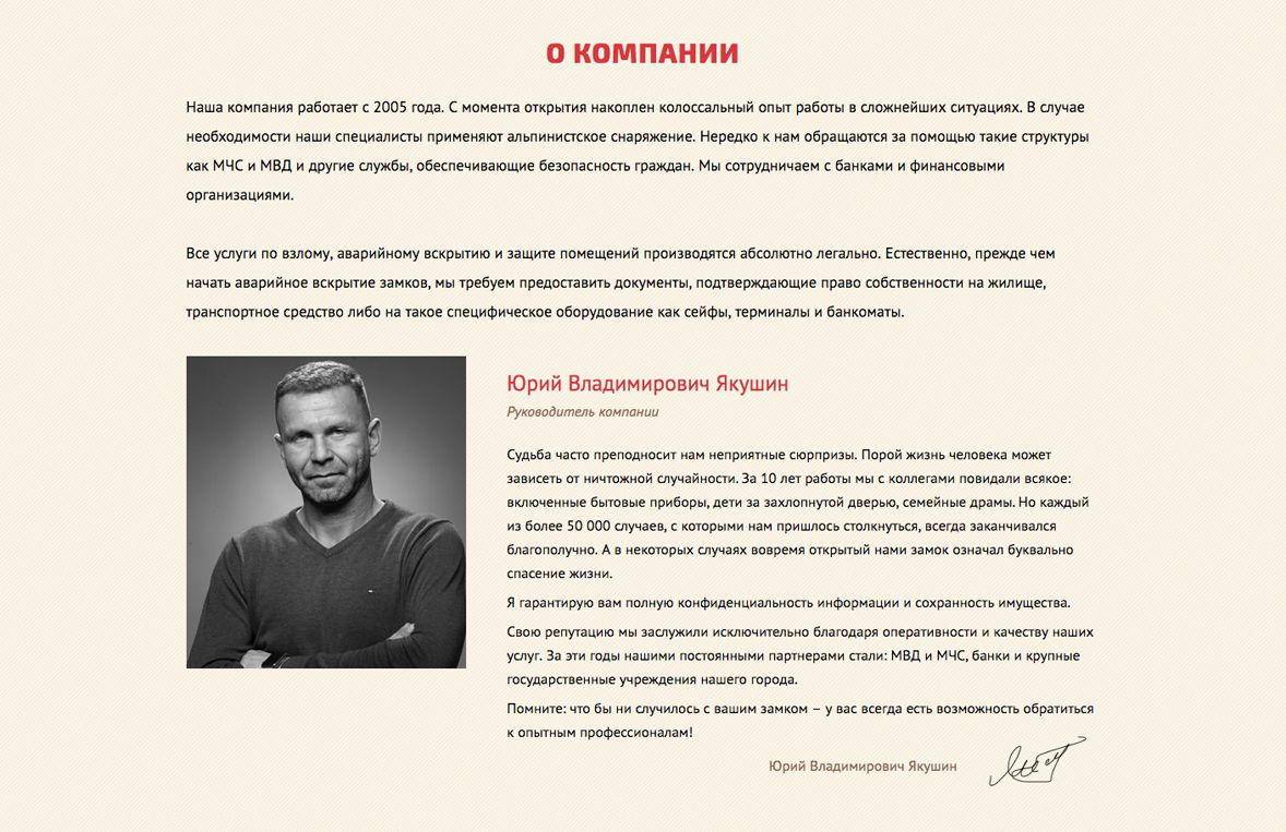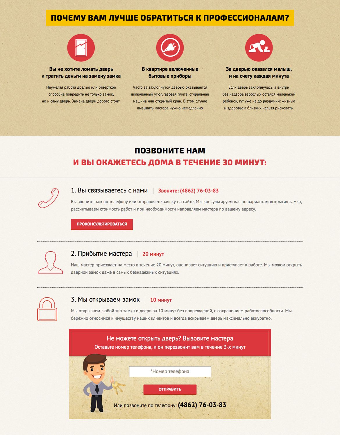 Этот вопрос у нас возник, когда понадобилось создать сайт для компании «Замок 57». Ситуации с запертыми дверями чаще всего экстренные, так что долго ходить по сайту человек не будет, и логичным решением стала разработка лендинга, где вся информация о компании размещена на одной странице, а факторы, которые влияют на выбор компании — скорость, легальность, конфиденциальность и опыт, расположили на первых экранах.