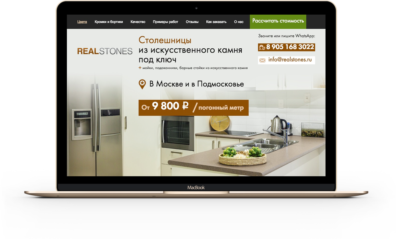 В итоге на одной странице мы рассказали о преимуществах, показали варианты цветов искусственного камня, разместили примеры работ и отзывы заказчиков, а также показали сотрудников и руководителя — простой ход, но куда приятнее видеть человека, а не обезличенную компанию.