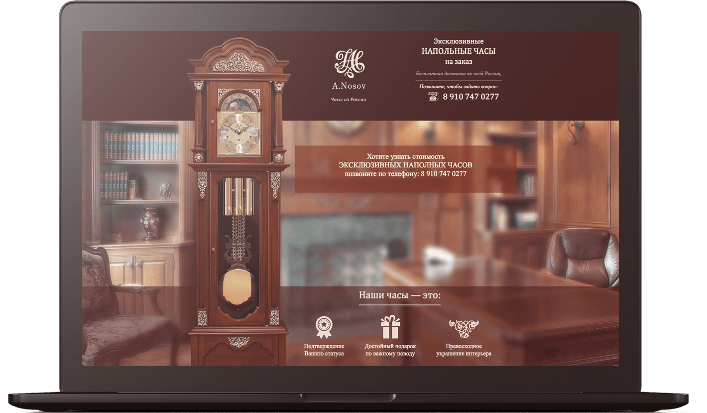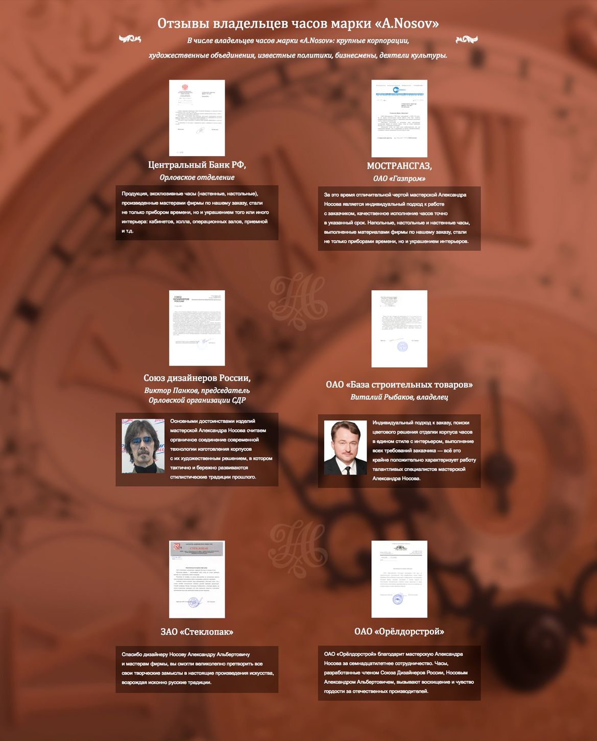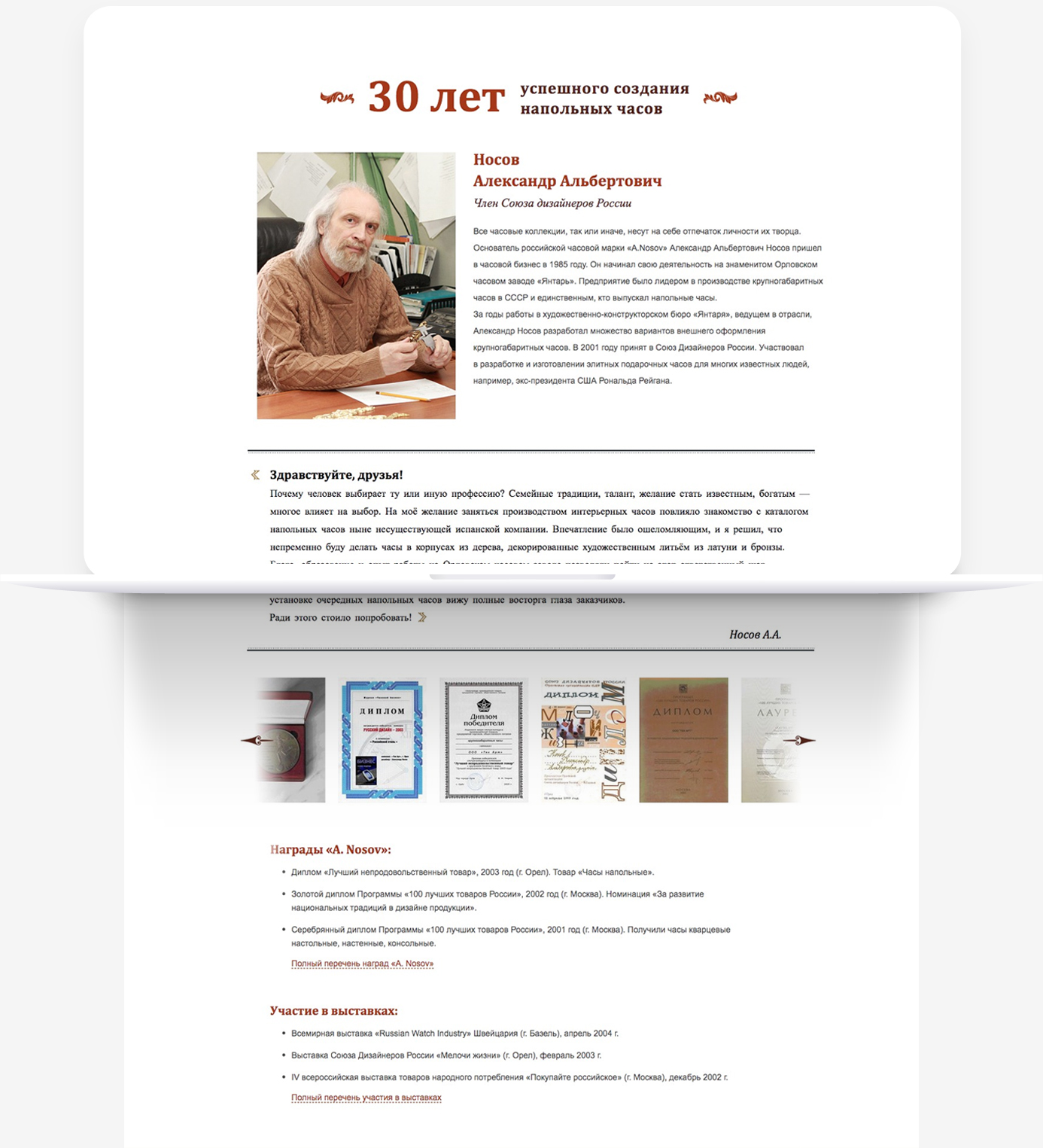 В мастерской «A. Nosov» изготавливают благородные часы с изящным декором, лендинг по стилю и настроению просто обязан им соответствовать, поэтому в дизайне использованы сдержанные классические цвета и декоративные элементы.