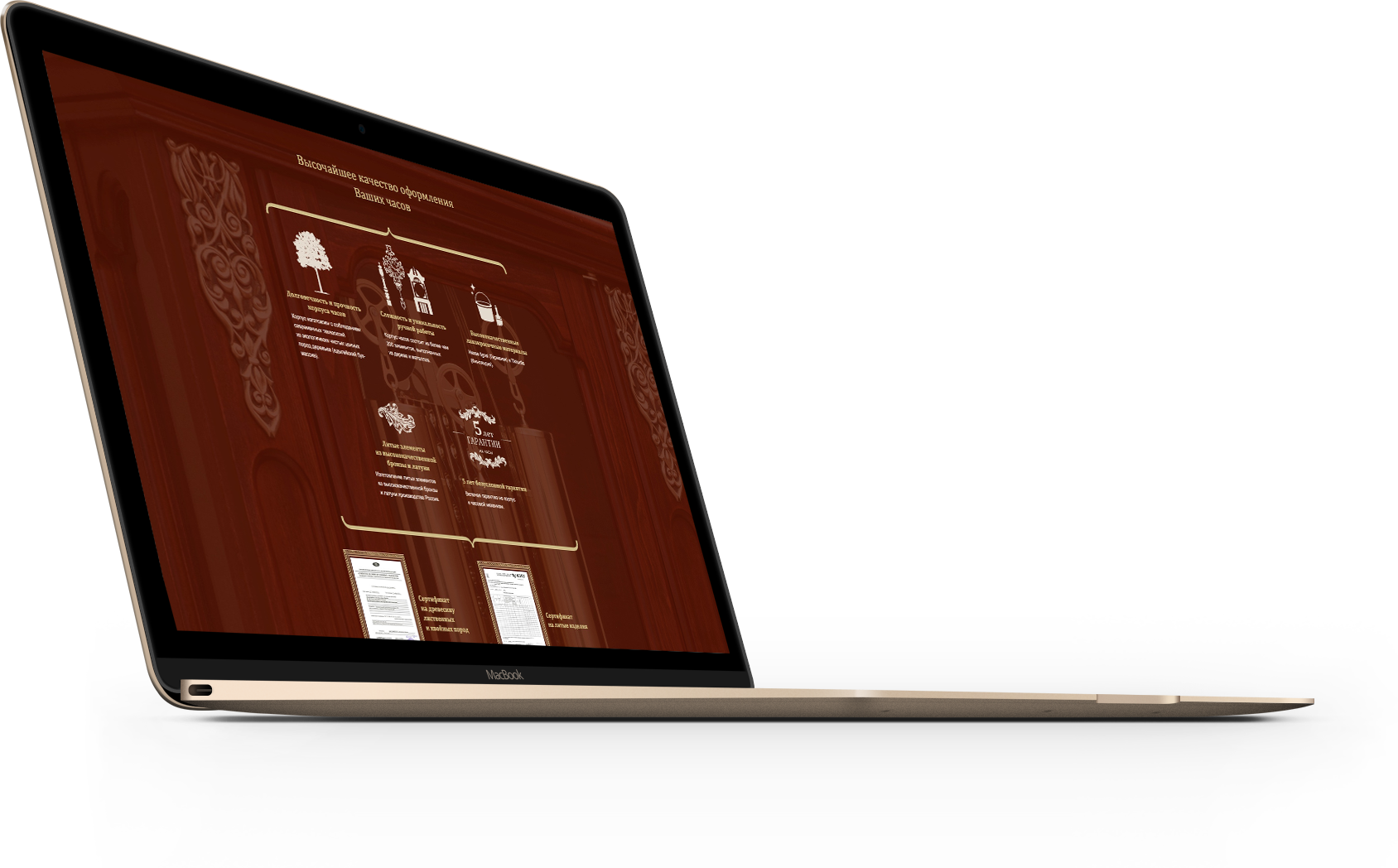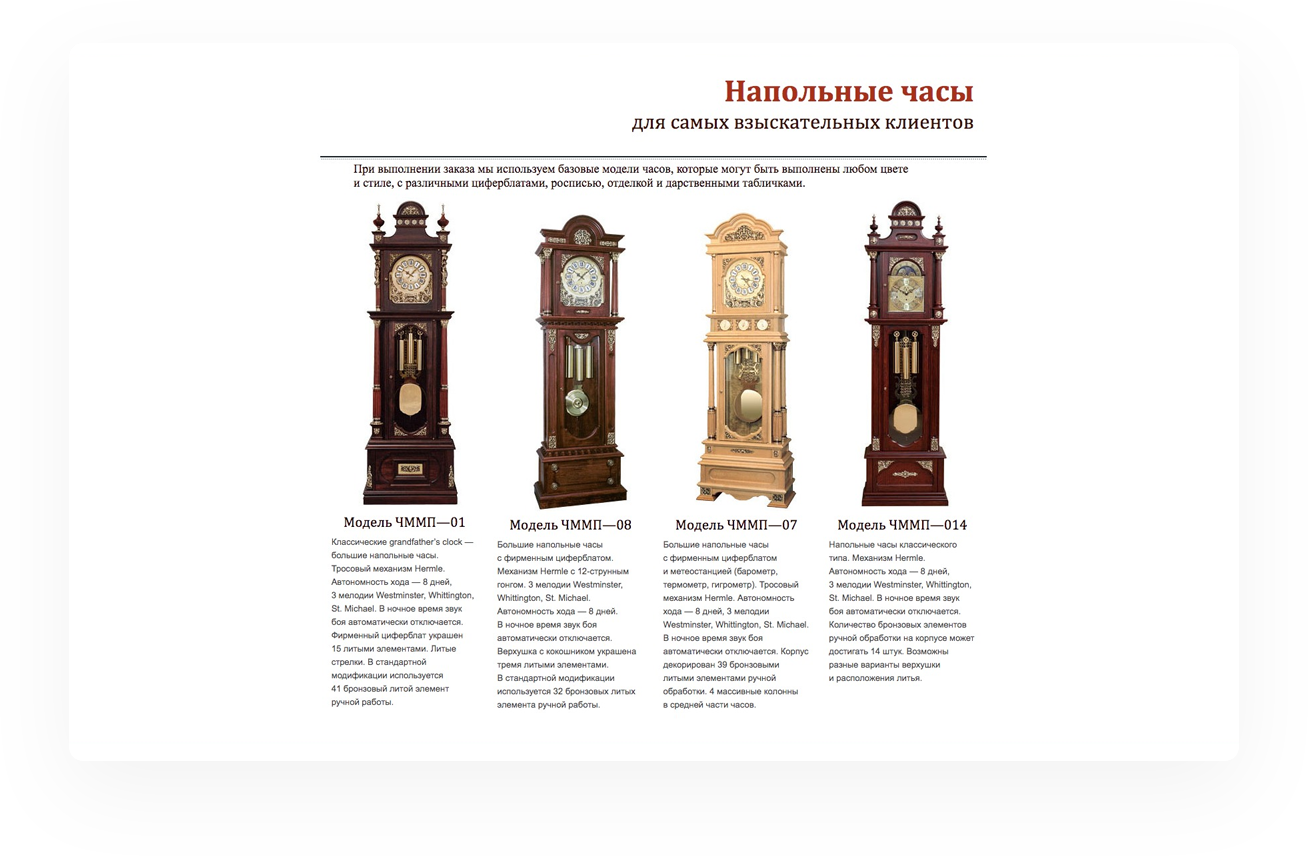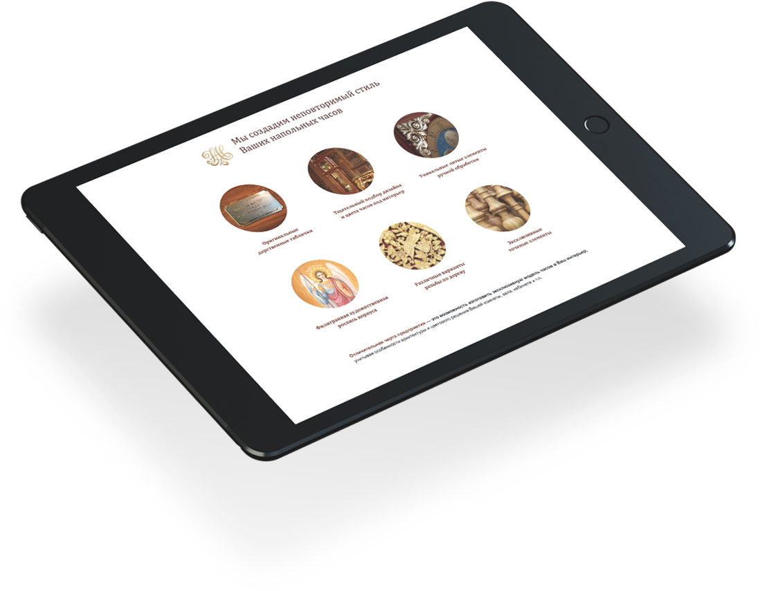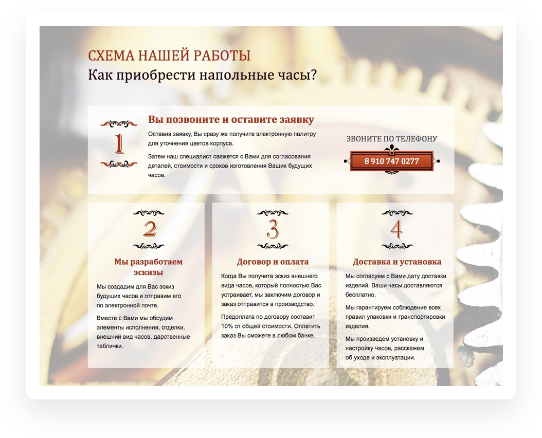 Поэтому для одностраничного сайта компании, изготавливающей напольные часы на заказ, мы использовали подходящую гамму в коричневых тонах с золотыми элементами.