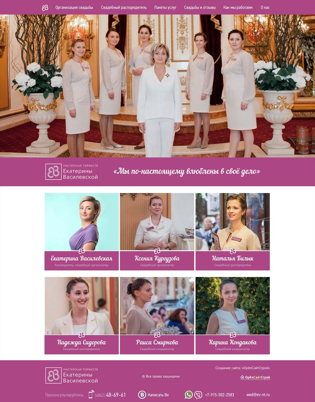 Мастерская торжеств — это люди, и в первую очередь, её основатель и руководитель Екатерина Василевская, чей опыт и знания помогают многим парам — помимо непосредственной организации праздников Екатерина ещё и проводит мастер-классы и обучает других свадебных специалистов.
