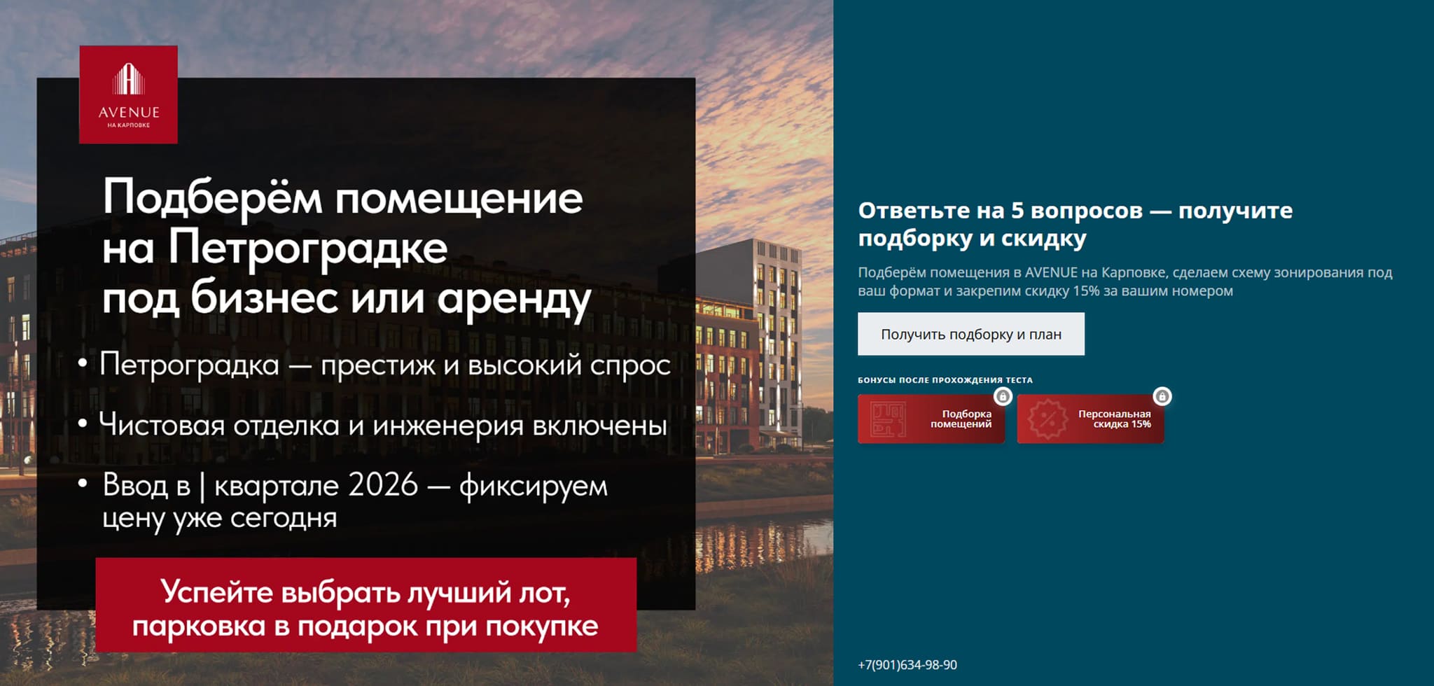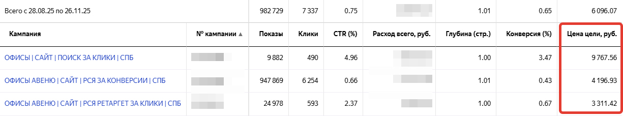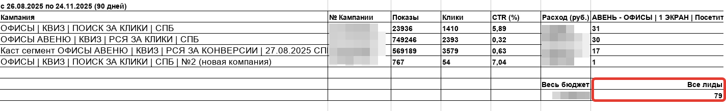 Для ниши коммерческой недвижимости Санкт-Петербурга такая стоимость считается очень низкой. Средняя цена лида по рынку обычно выше: от 10 000 ₽ на холодном трафике.