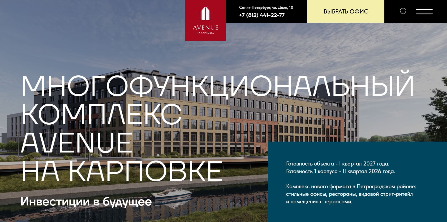 Avenue на Карповке — инвестиционный проект ГК «БестЪ» на Петроградской стороне. В составе — компактные офисы и автономные этажи с отдельной инженерией и паркингом. Проект находится в стадии строительства.