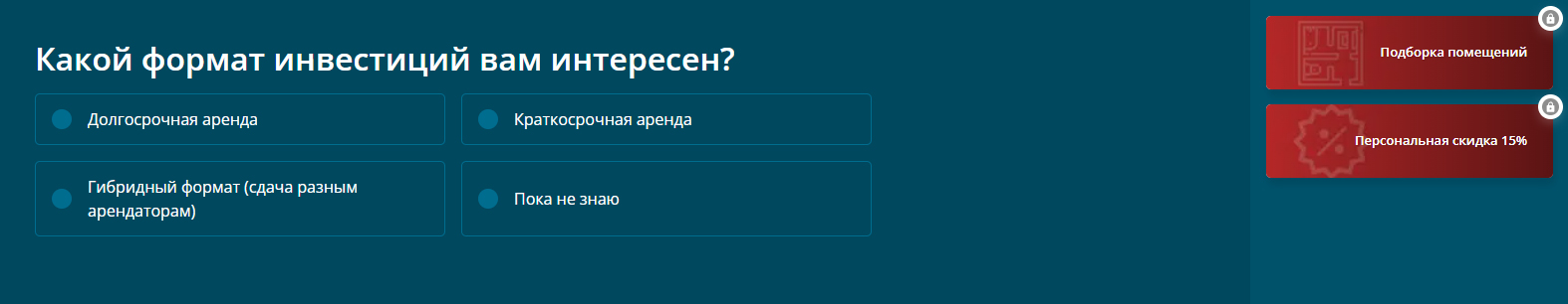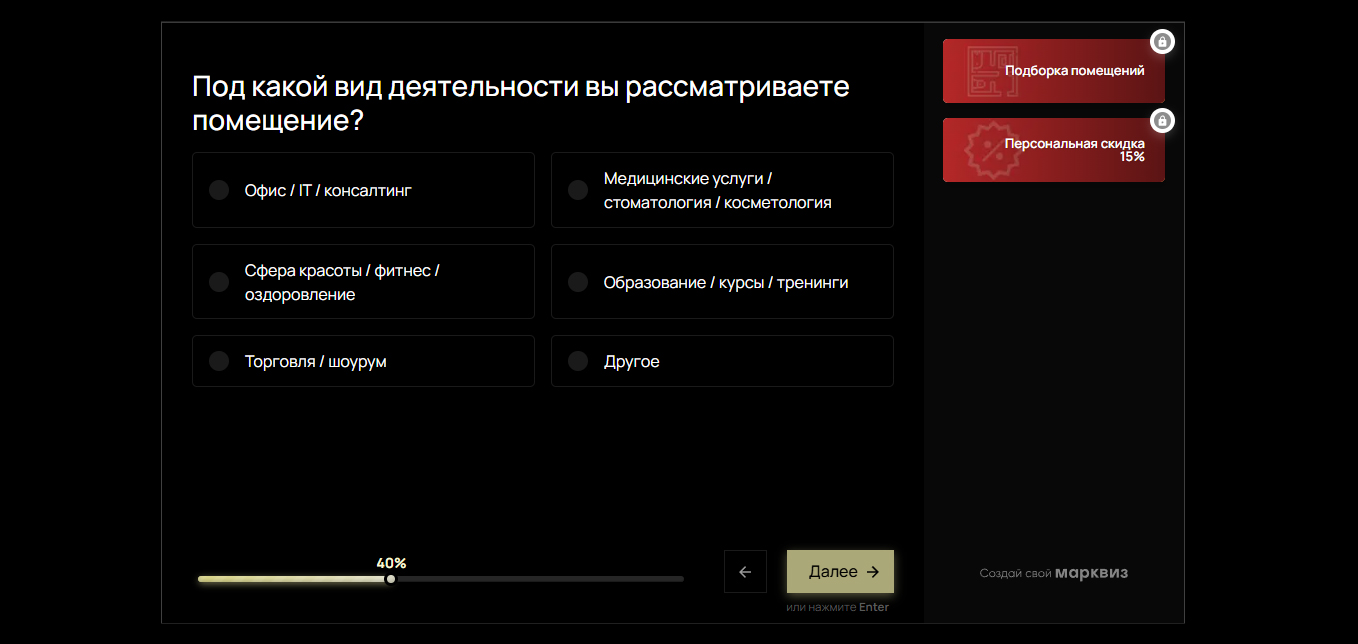 С нуля продумали внутреннюю логику квиза. Разделили сценарии на две ветки: для тех, кто рассматривает объект под открытие или расширение бизнеса, и для инвесторов, которым важно сдавать недвижимость в аренду и получать доход. Такой подход позволил персонализировать путь для каждого сегманта целевой аудитории.
