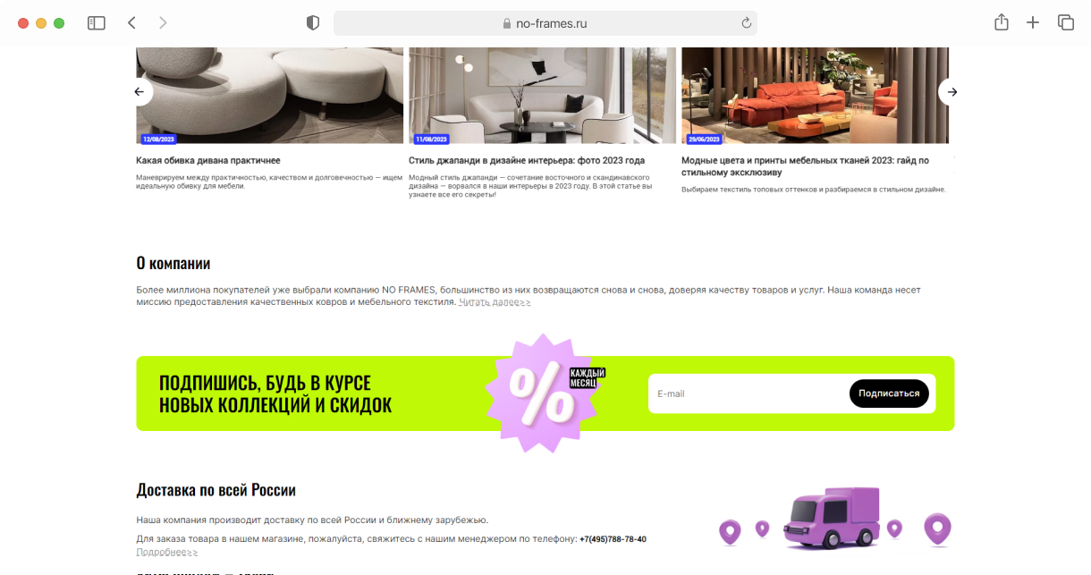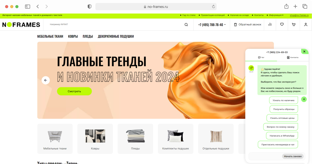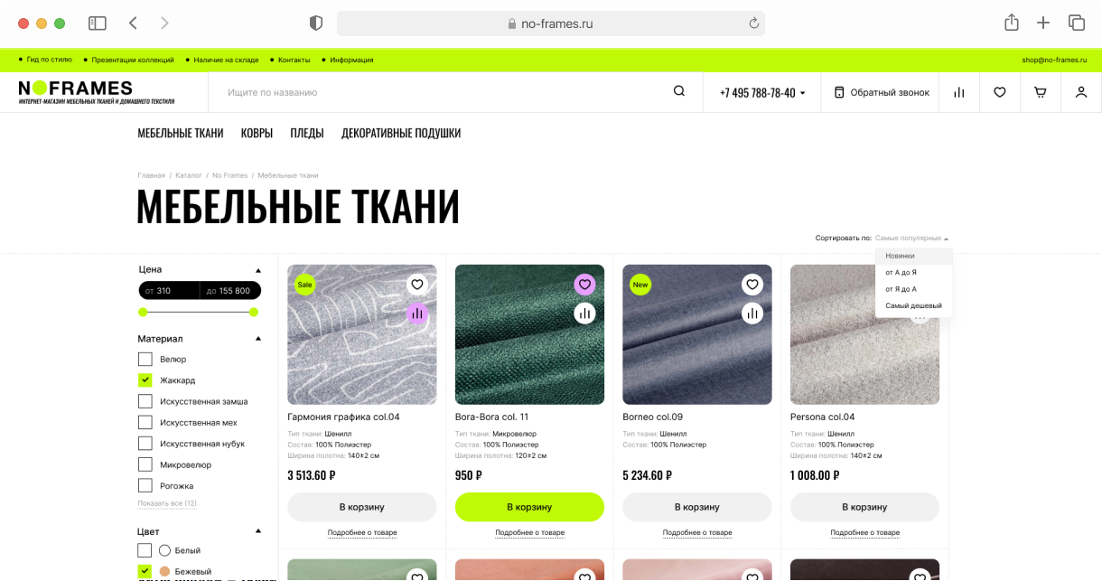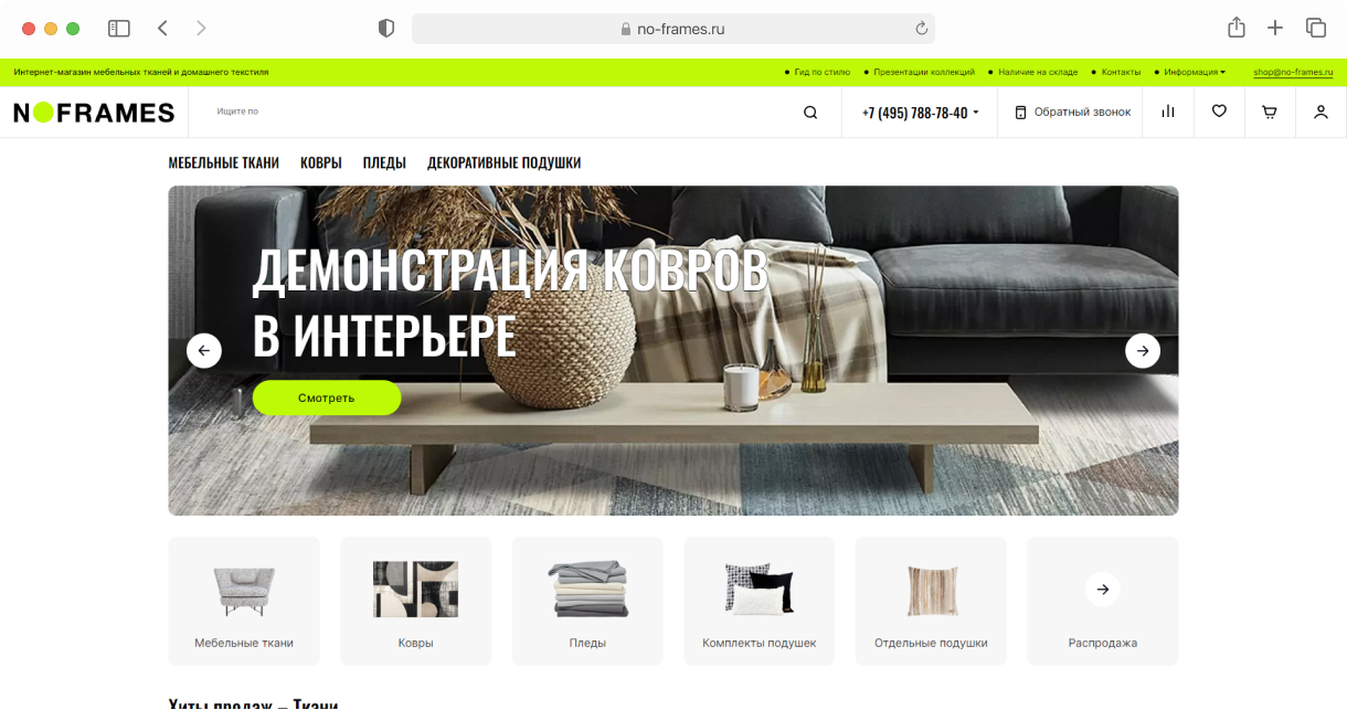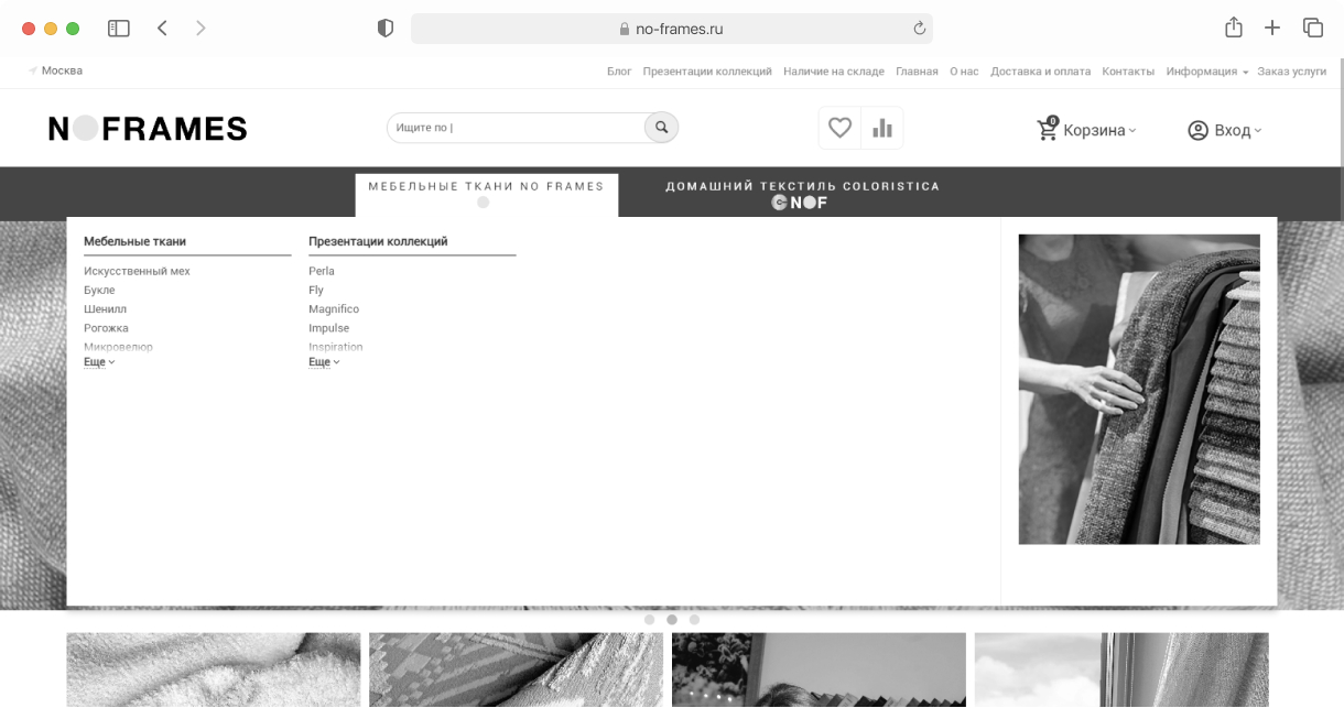 Интернет-магазин NoFrames предлагает новинки и тренды мебельных тканей, домашнего текстиля, а также готовые решения для интерьера. Наша цель заключалась в улучшении сайта, его оптимизации и обновлении дизайна.