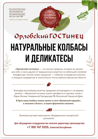 О качестве говорит и само название компании — «Орловский ГОСТинец». Орловский: потому что ингредиенты и сама продукция производится в Орле. ГОСТинец: потому что продукты произведены по ГОСТам — их вы можете дарить людям, когда хотите выразить им своё расположение.