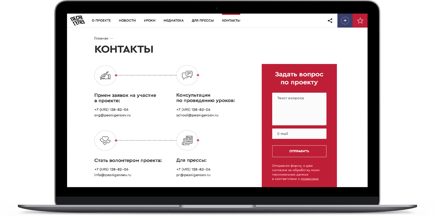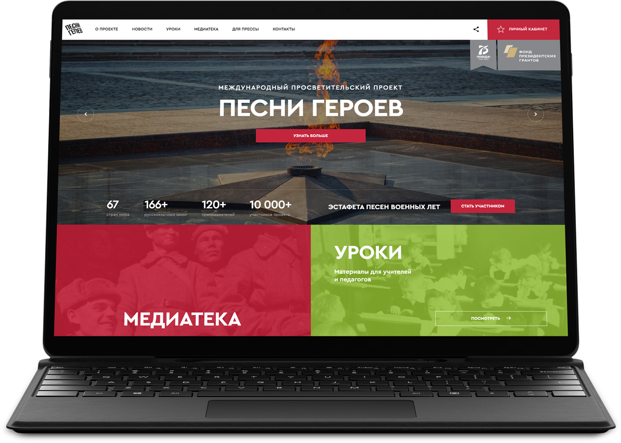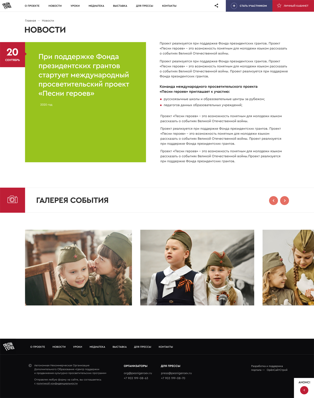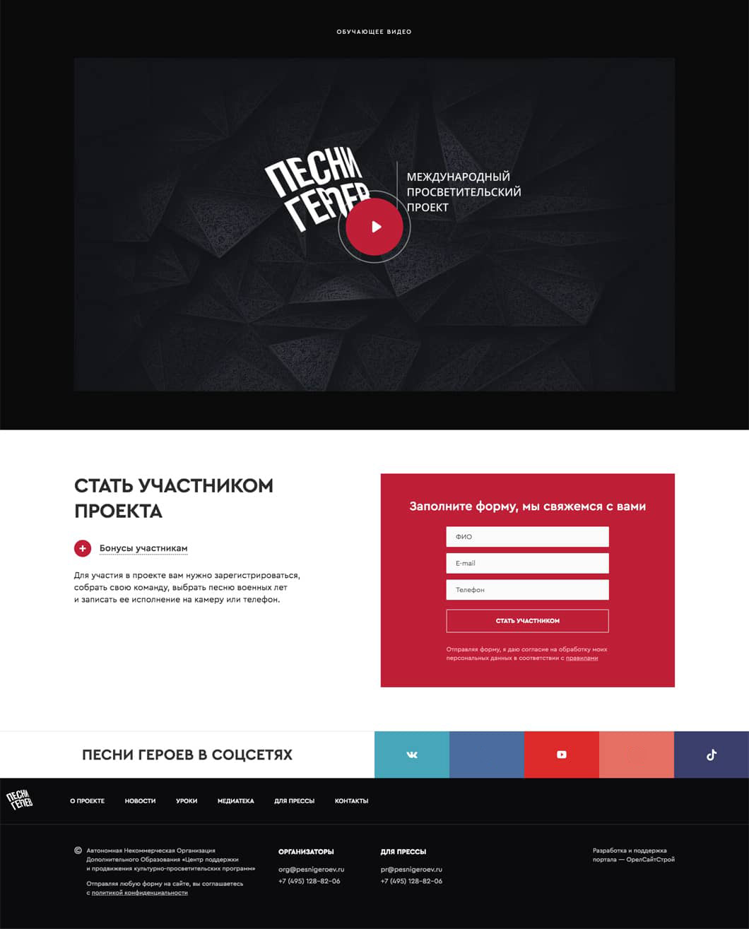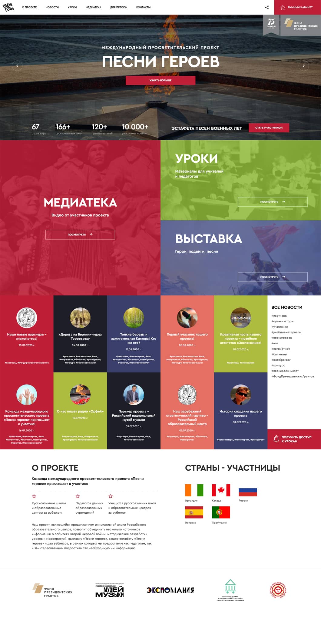 История. Заказчик сообщил, что в 2019 году Российский образовательный центр в Испании провёл пробную акцию-эстафету «Песни героев». Акцию поддержали учителя и учащиеся образовательных центров и школ Ирландии, Испании, Алжира, Иордании, Палестины, Южной Осетии, Мексики, России. Стало ясно: нужна методическая база для педагогов, где совмещён творческий и образовательный процессы.