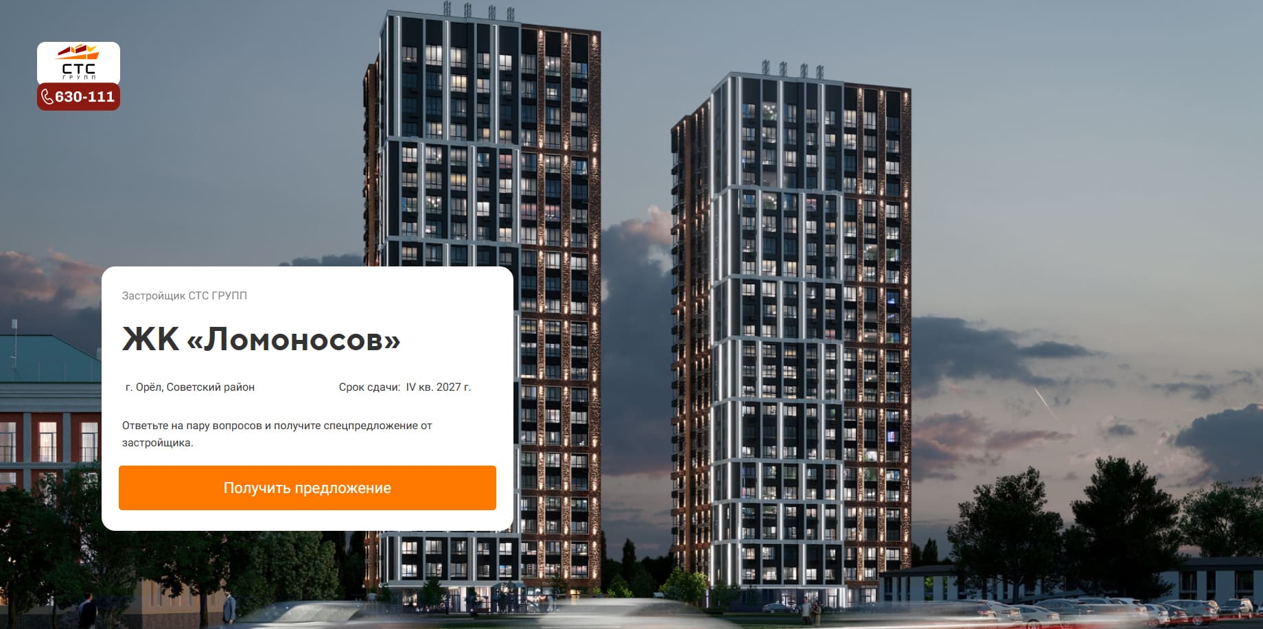 Стартовый экран включает ключевую информацию о ЖК «Ломоносов»: название проекта, адрес, срок сдачи и призыв к действию. Дополнительно мы разместили логотип и номер телефона, чтобы у посетителей была возможность позвонить напрямую.