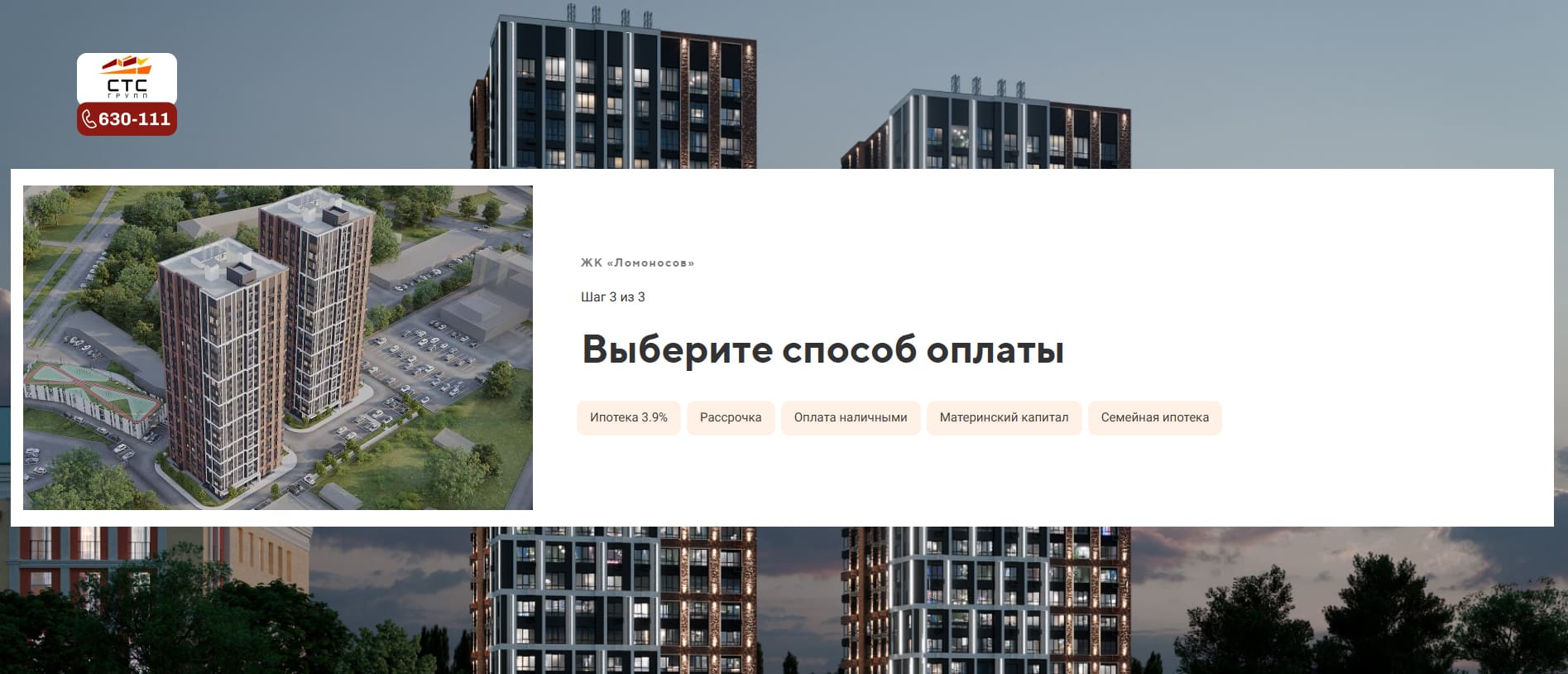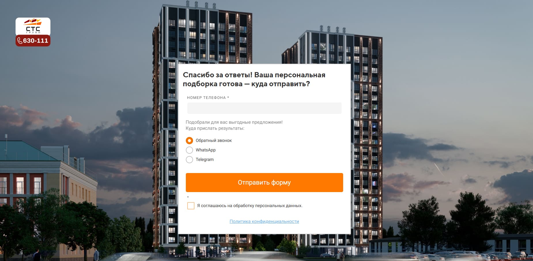 На финальном шаге предлагаем оставить контакты, чтобы получить персональную подборку квартир. После отправки данных пользователь попадает на страницу «Спасибо», где мы дополнительно закрепляем контактные данные отдела продаж: телефон, каналы связи и ссылку на основной сайт застройщика.