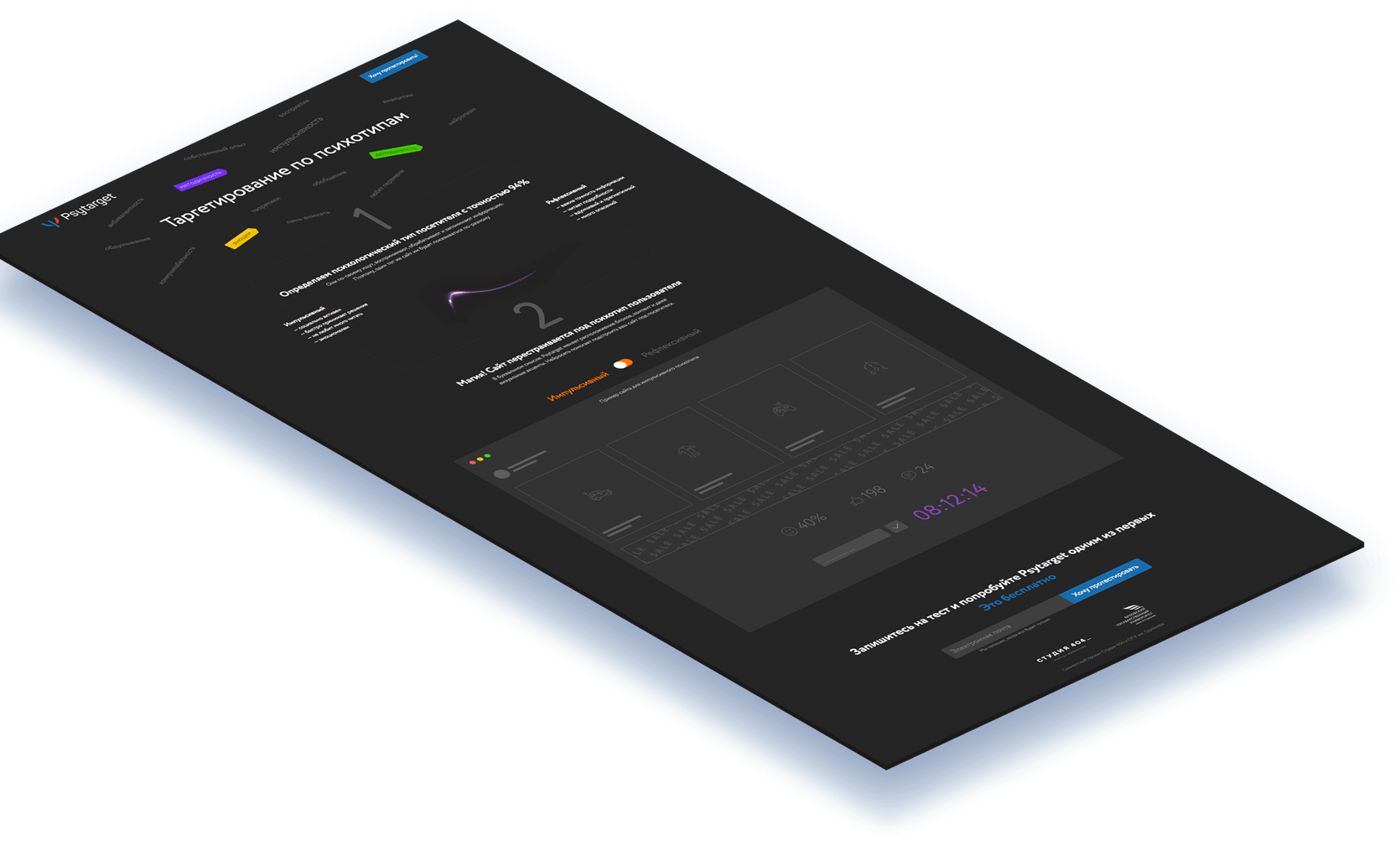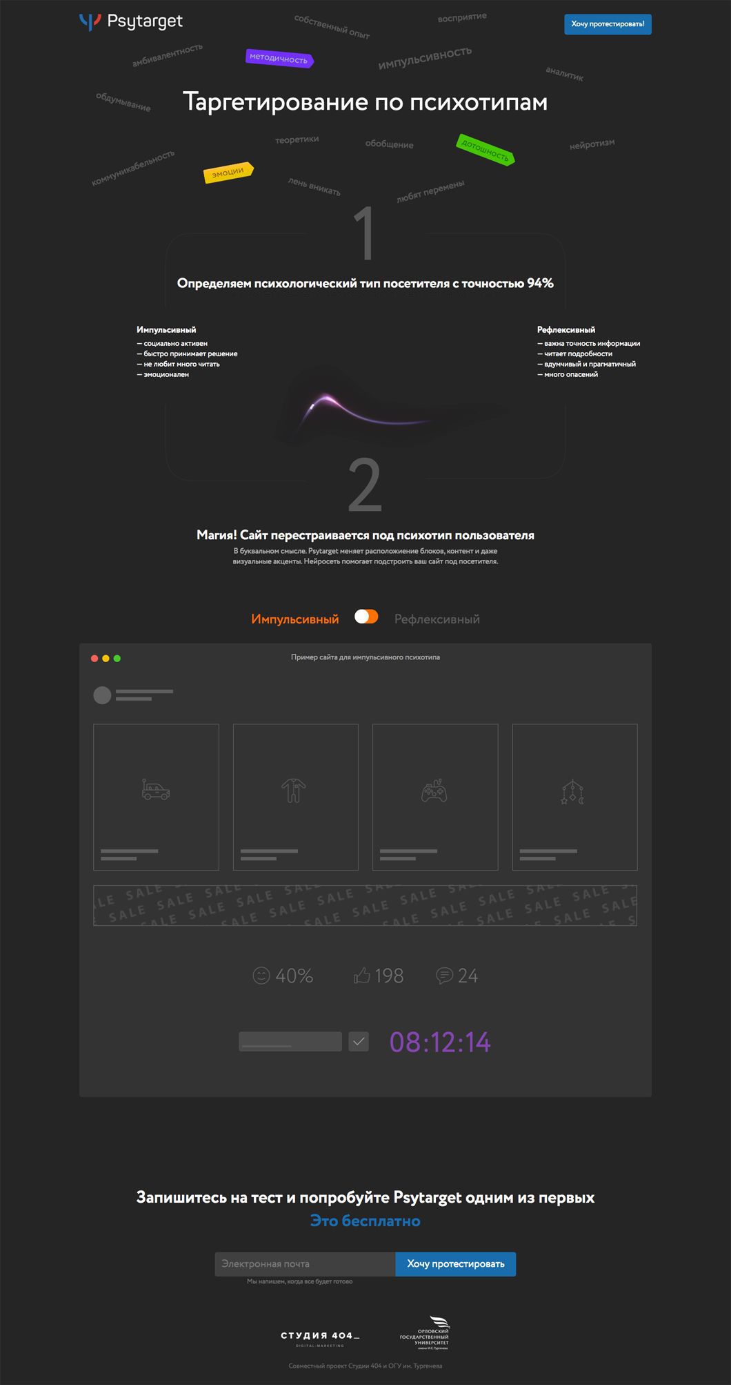 Собственная разработка нашей студии совместно с ОГУ имени И.С.Тургенева. Это нейросеть, которая определяет психологический тип пользователя с точностью до 94% и незаметно для него перестраивает ваш сайт. Psytarget буквально меняет расположение блоков, контент и даже визуальные акценты. В основе деления на психотипы использована актуальная психологическая типология личностей — импульсивный (социально активен, быстро