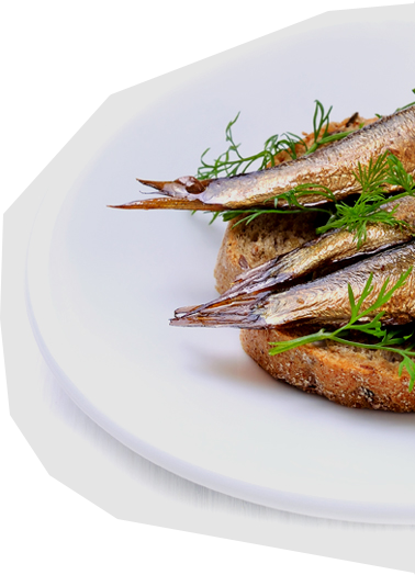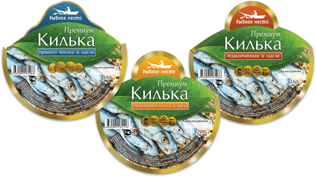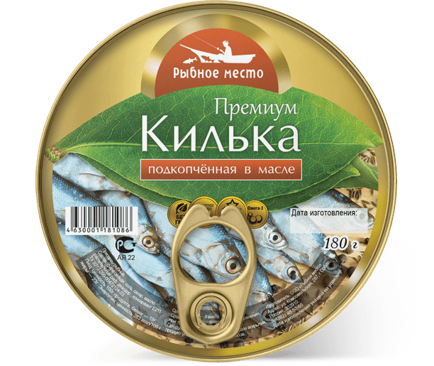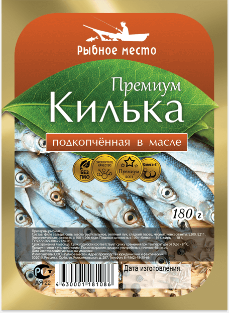 Яркая этикетка для кильки. Аппетитная фотография нового продукта «Килька подкопчённая в масле». Этикетка нестандартной фигурной формы.