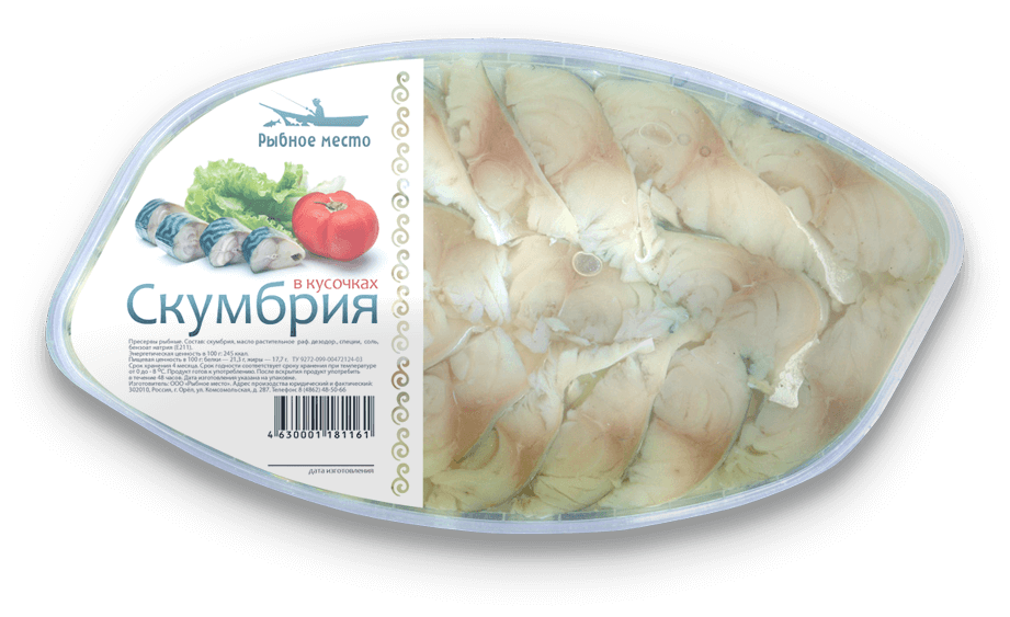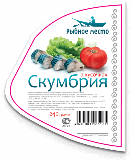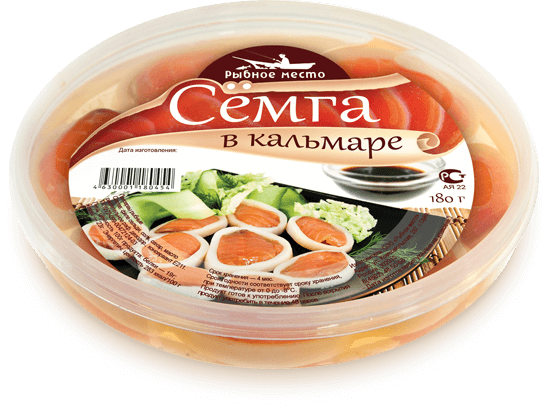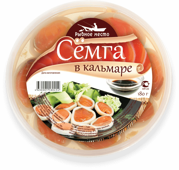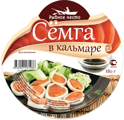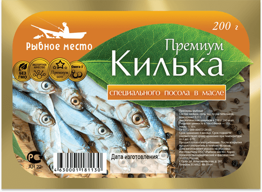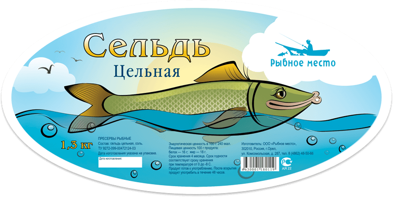 Нестандартное оформление рыбной упаковки. Иллюстративная симпатичная улыбающаяся рыбка и ласковое море. Чайки на заднем фоне — покупатели. Этикетка получилась достаточно ироничной, дарящей хорошее настроение.