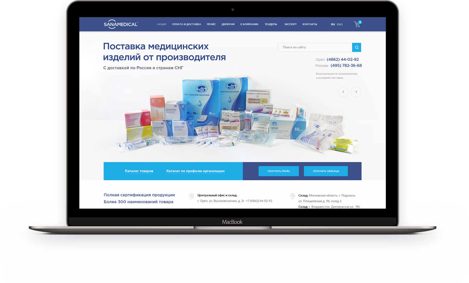 Особое внимание мы уделяем прототипированию и разработке страницы «Контакты», именно после её посещения клиент обращается в компанию. Клиенты Sanamedical — компании из различных отраслей, располагающиеся во всех регионах России. Чтобы стать «ближе» к ним, мы разместили на странице контактов не только адрес и телефон центрального офиса, но и контакты филиала в Москве, телефоны специалистов, контакты складов, карты проезда и даже координаты GPS.